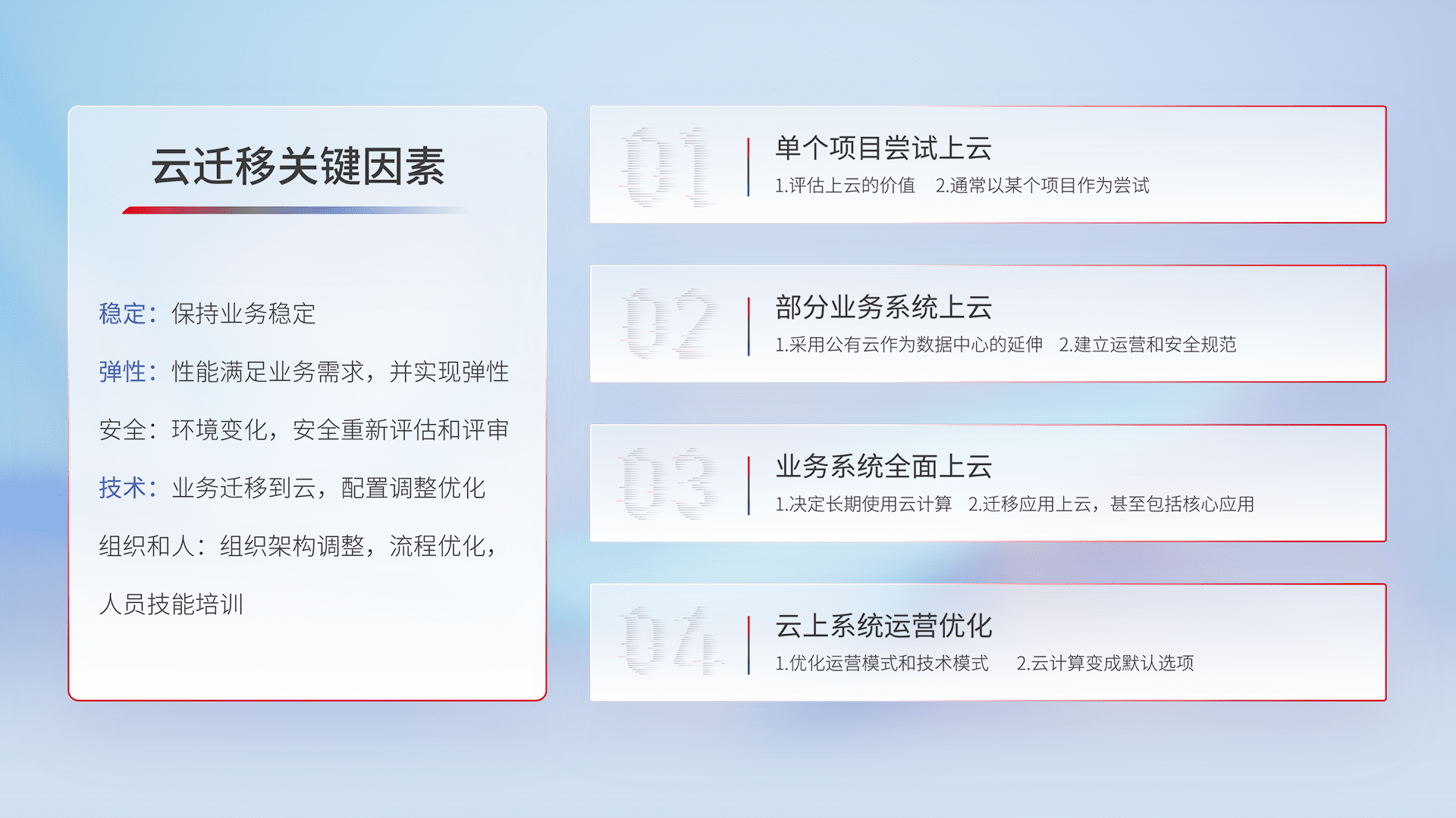 结合实际业务,,,从规划设计、、、云平台选型、、、、云原生改造、、、数据迁移、、、集成交付,,,,迁移全过程为客户识别最佳上云路径,,,,做好风险识别管理,,设计网络架构、、身份权限、、、安全审计合规、、、操作审计、、日志审计、、、、监控告警策略、、多站点容灾设计等,,,,对云上基础设施进行整体规划,,提升IT治理水平,,,,以满足弹性、、、、高可用、、、高性能的需求。。。。