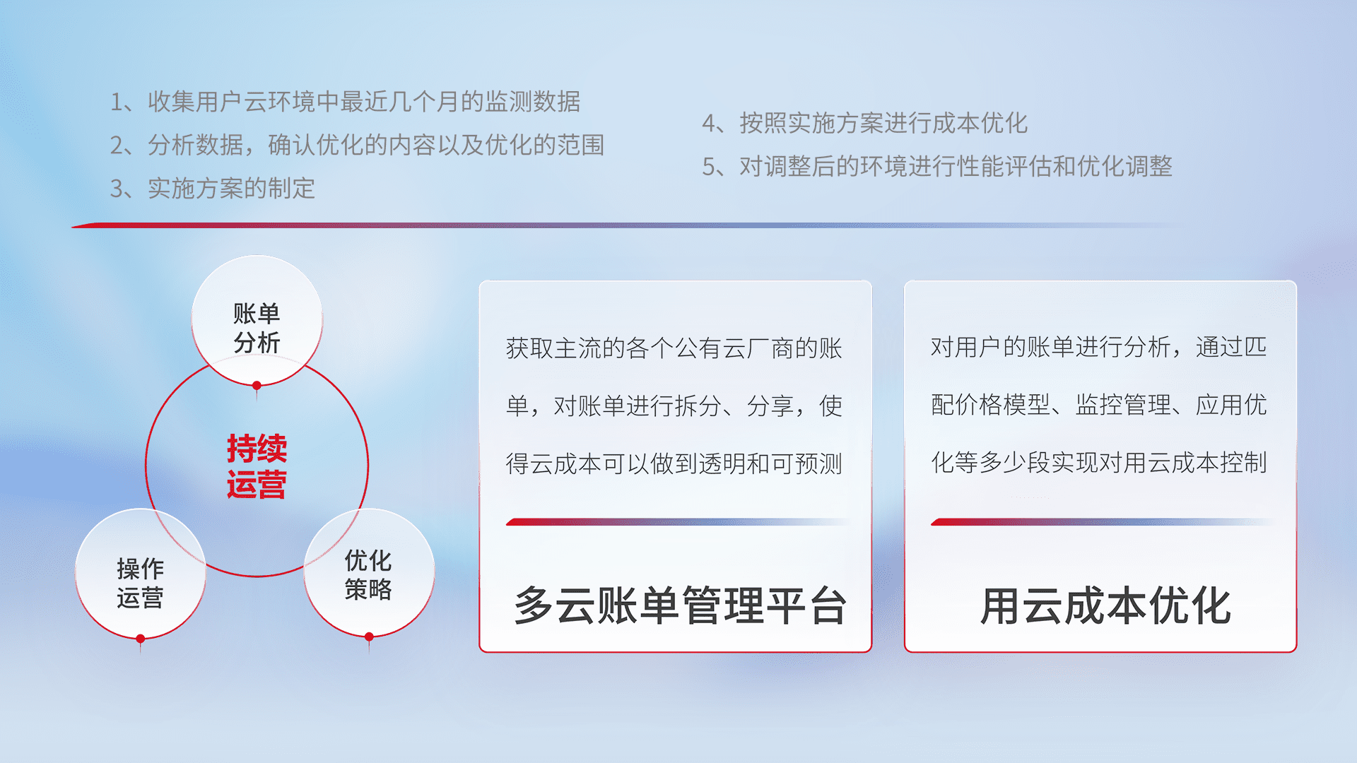 通过多云纳管,,,以统一的资源数据模型把客户的云资源进行抽象和封装,,进而实现对多云资源的统一操作,,,,保障云资源管理的可靠性、、、稳定性与可用性。。。量身定制化运维内容,,,配置、、、开发运维、、补丁管理、、、、备份、、监控、、、认证和访问管理、、审计和日常巡检等,,,,保障在用云过程中的可靠度,,,稳定度以及高可用率。。